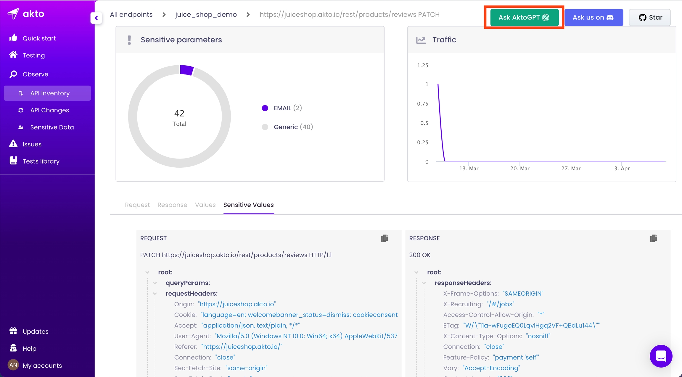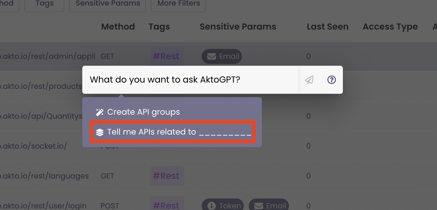 You can use AktoGPT to look for any sensitive or PII parameters in the API payload. Follow these steps -