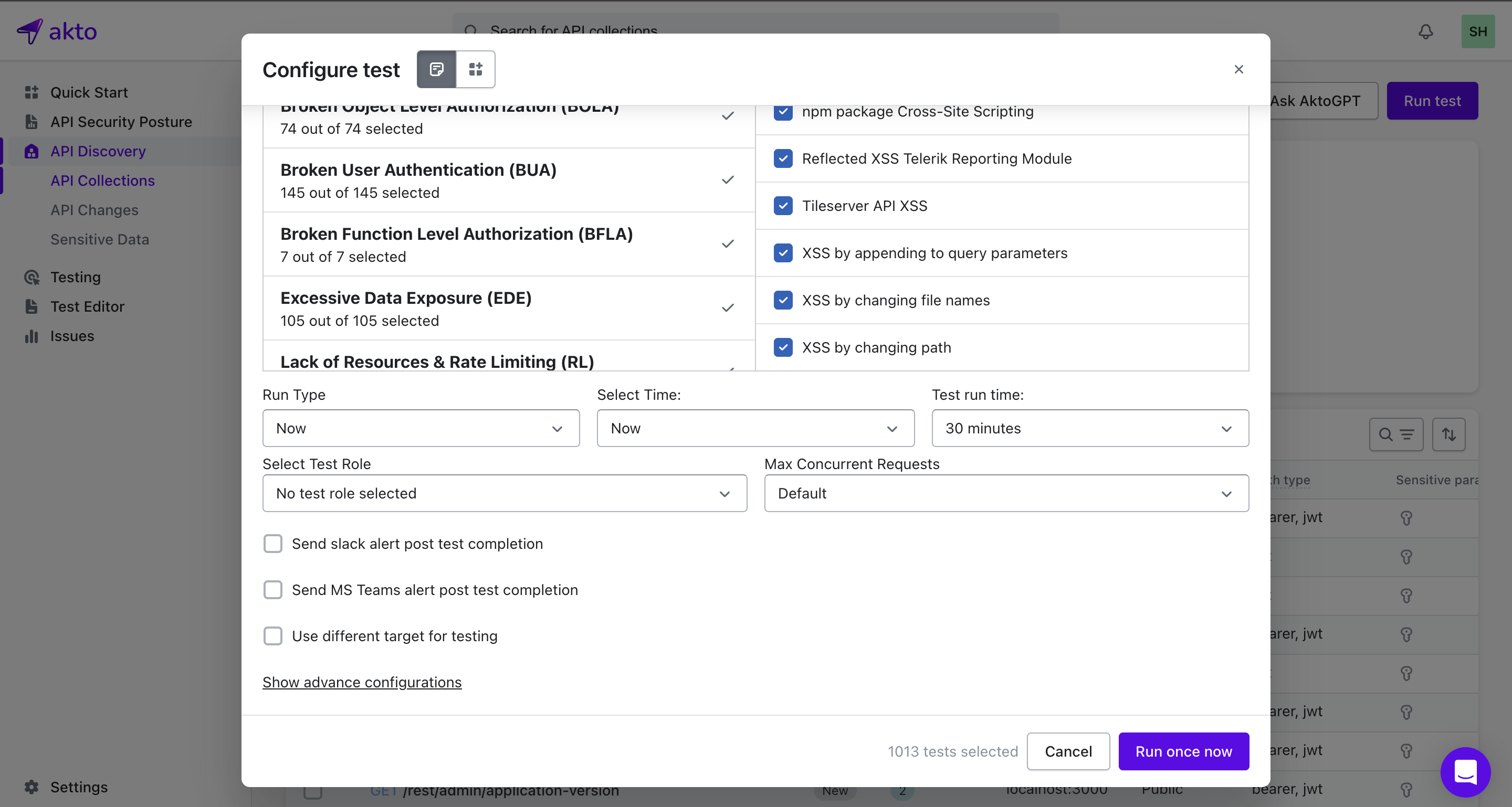 Akto also supports **reminder alerts** to help you stay prepared for upcoming scheduled tests. By enabling the **Pending tests alerts** option in the Webhook settings, you will receive a notification **one hour before** any scheduled test is set to run. This ensures your team is aware and can take any necessary preparatory actions before the security test begins.