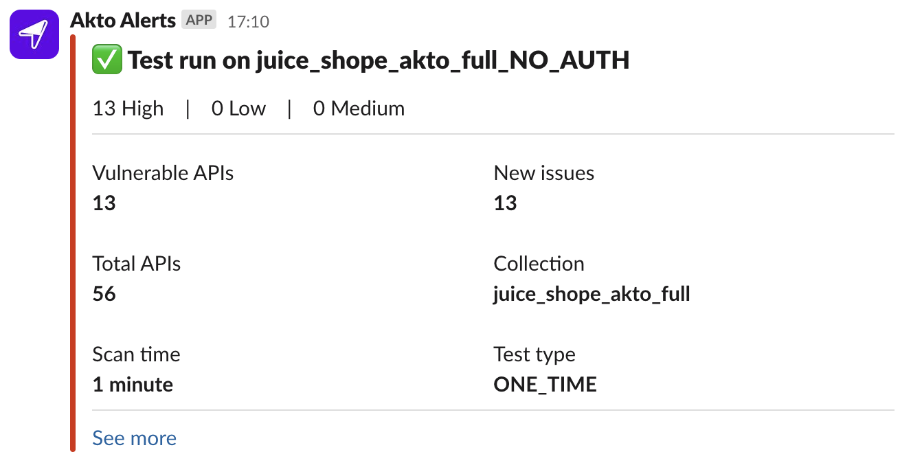 Slack integration with Akto enables automatic notifications in your Slack channels when new API endpoints are discovered and security issues are detected. This integration ensures your team stays informed about API changes and potential security concerns in real-time within your Slack workspace.