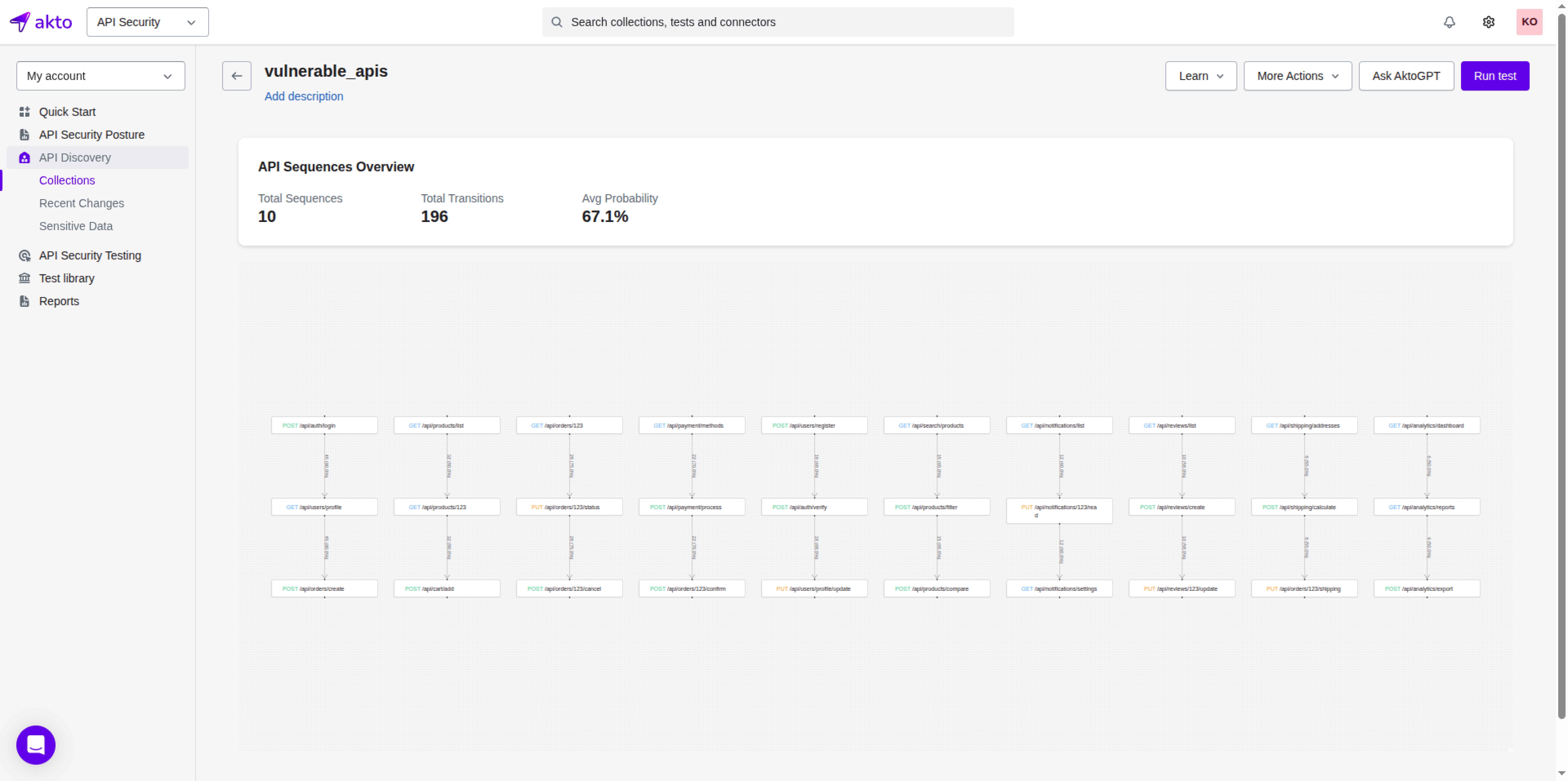 Akto automatically detects API sequences based on traffic patterns and presents them with visual flow charts and associated statistics.