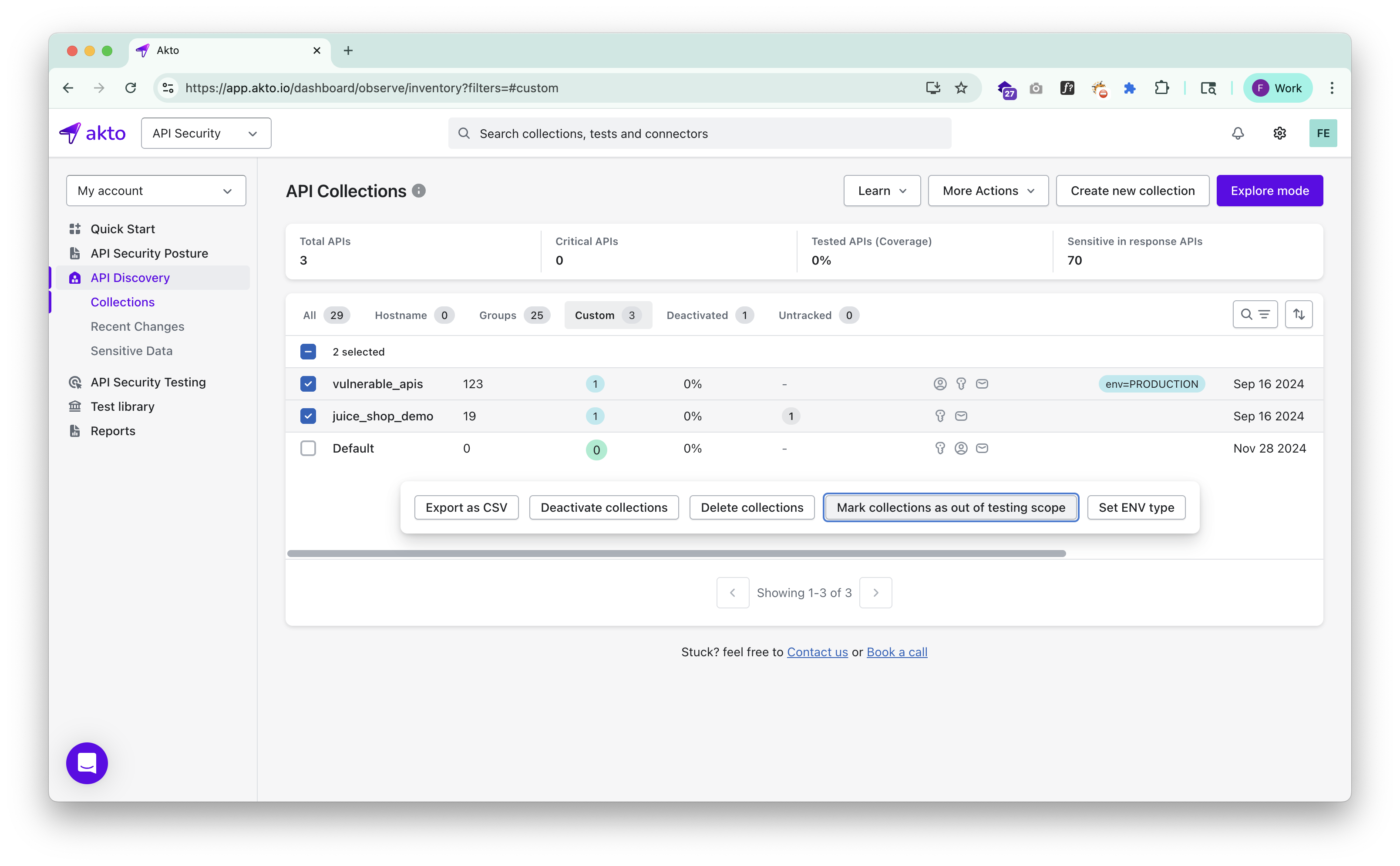 * Collections marked out of scope will still appear in your inventory, but they won’t be part of **API Security Testing**.