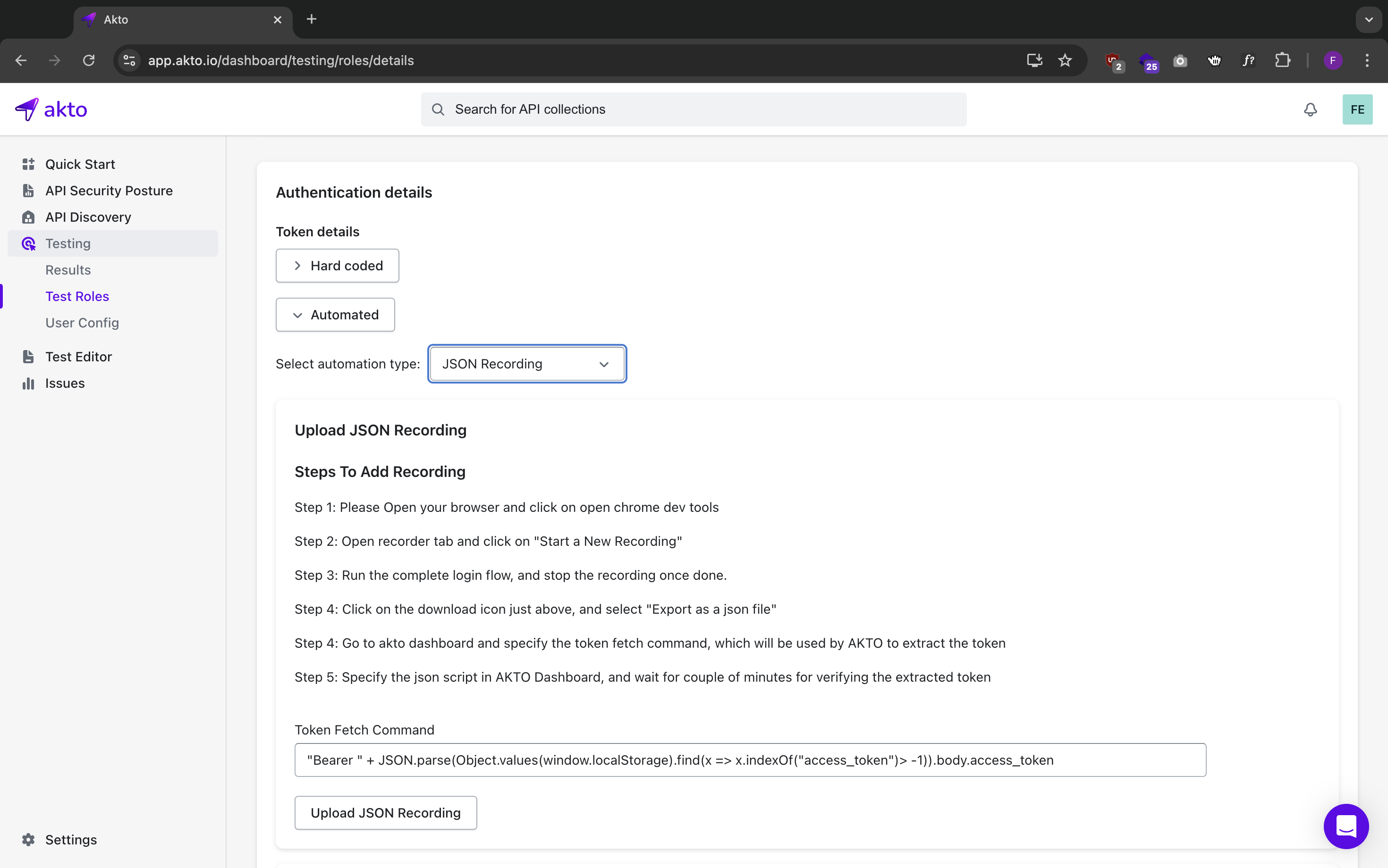 JSON Recording is a feature in Akto that automates the process of capturing and managing authentication tokens for API testing. It allows you to record the authentication flow once and reuse it automatically in your security tests, ensuring consistent and reliable API testing with valid authentication. Learn how to [Set Up JSON Recording for Auth Tokens](https://docs.akto.io/api-security-testing/how-to/set-up-json-recording-for-auth-tokens).