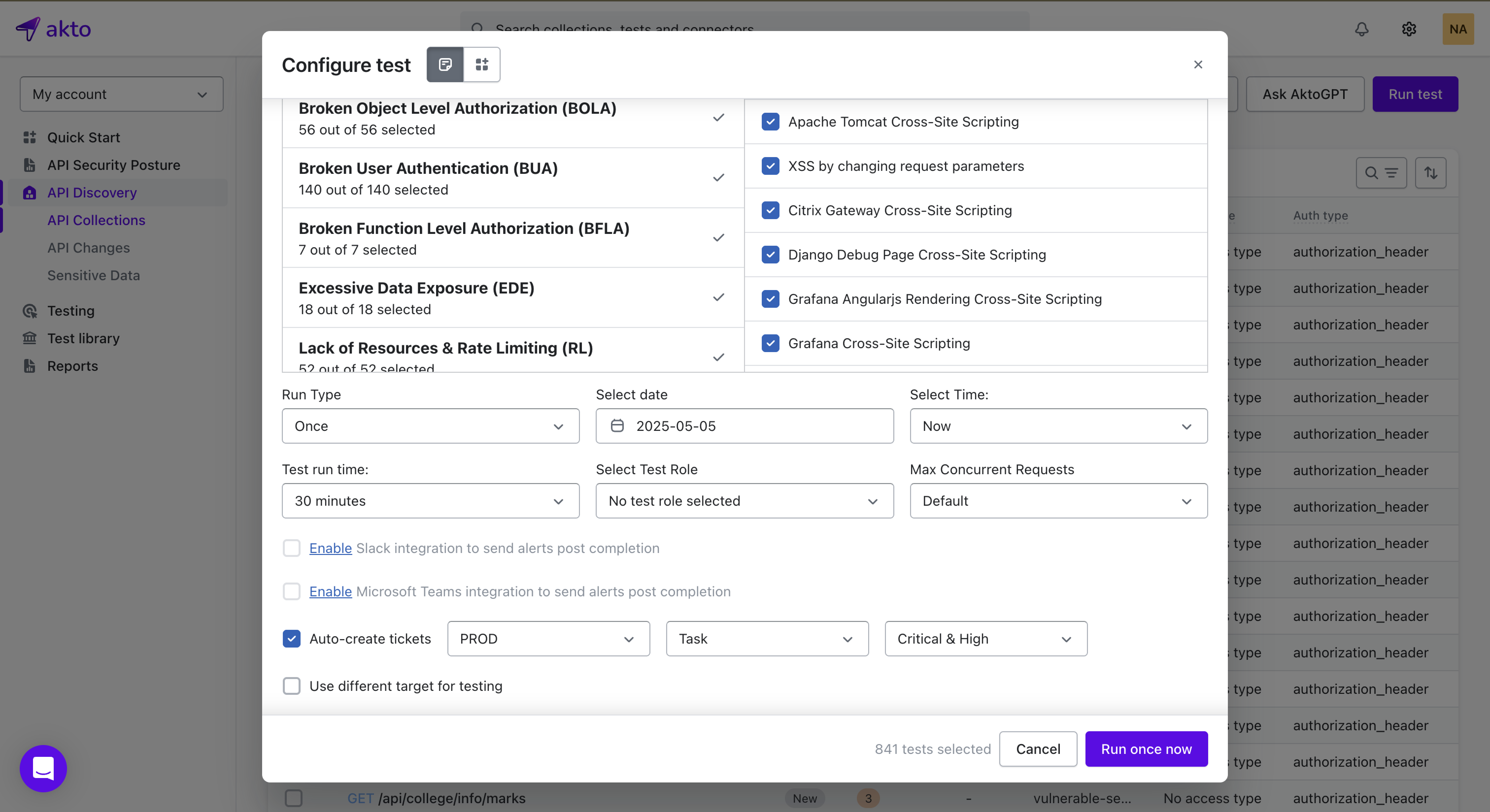 When setting up a test run in Akto, you will see the option to **Auto-create tickets**. Once enabled, Akto will automatically create Jira tickets based on the vulnerabilities detected.