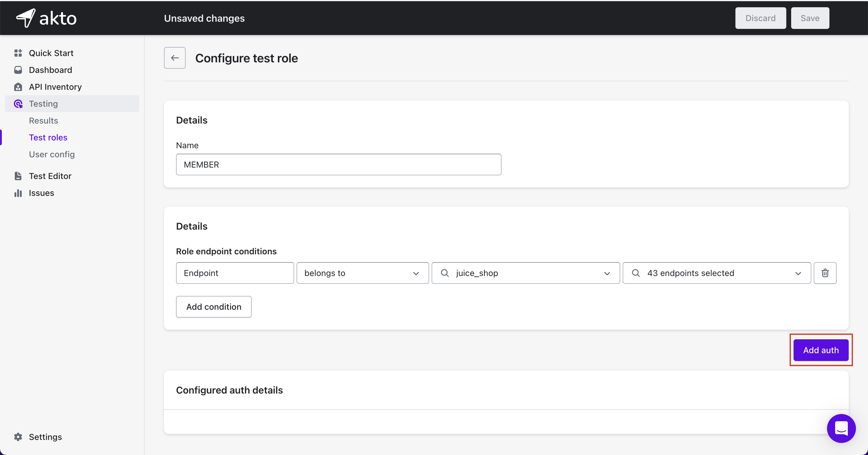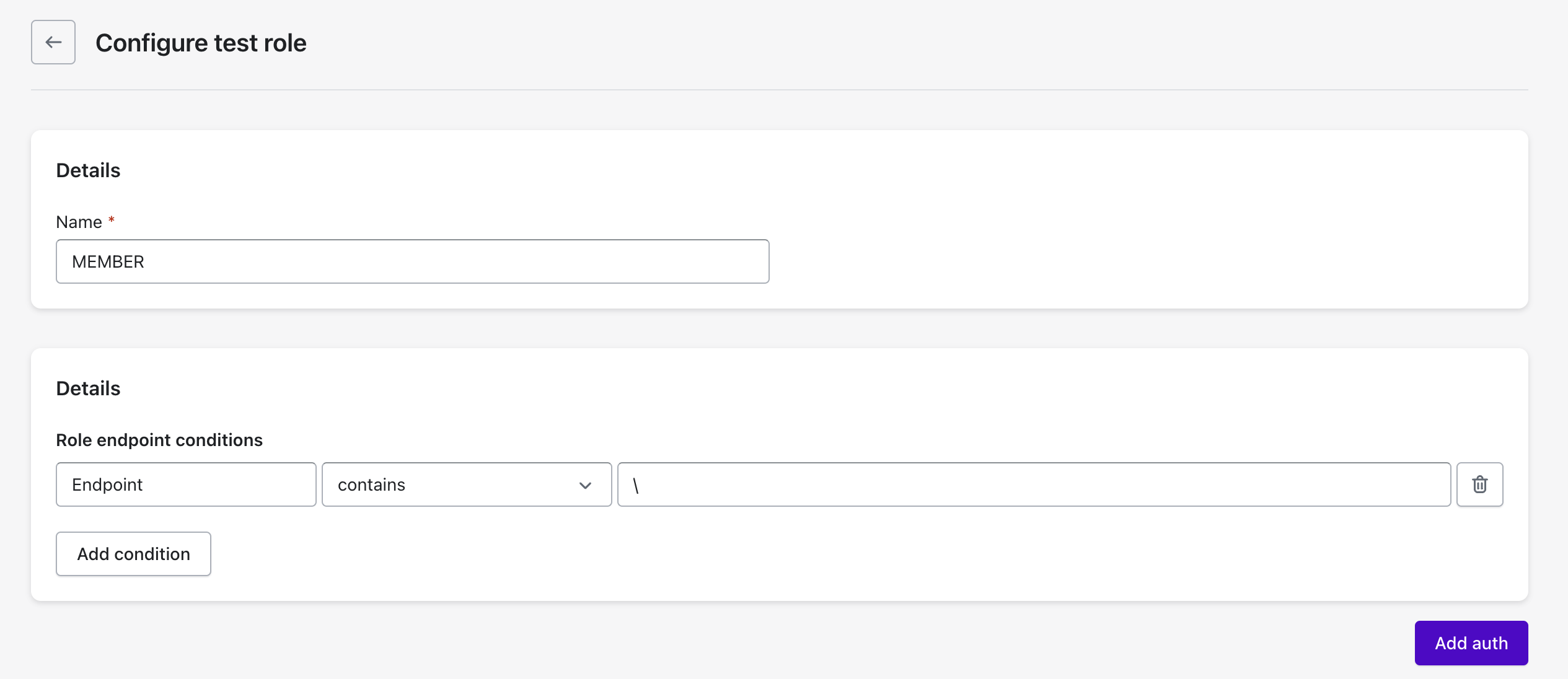 Create a [test role](#create-a-test-role). Click on the test role and click on `Add auth`.