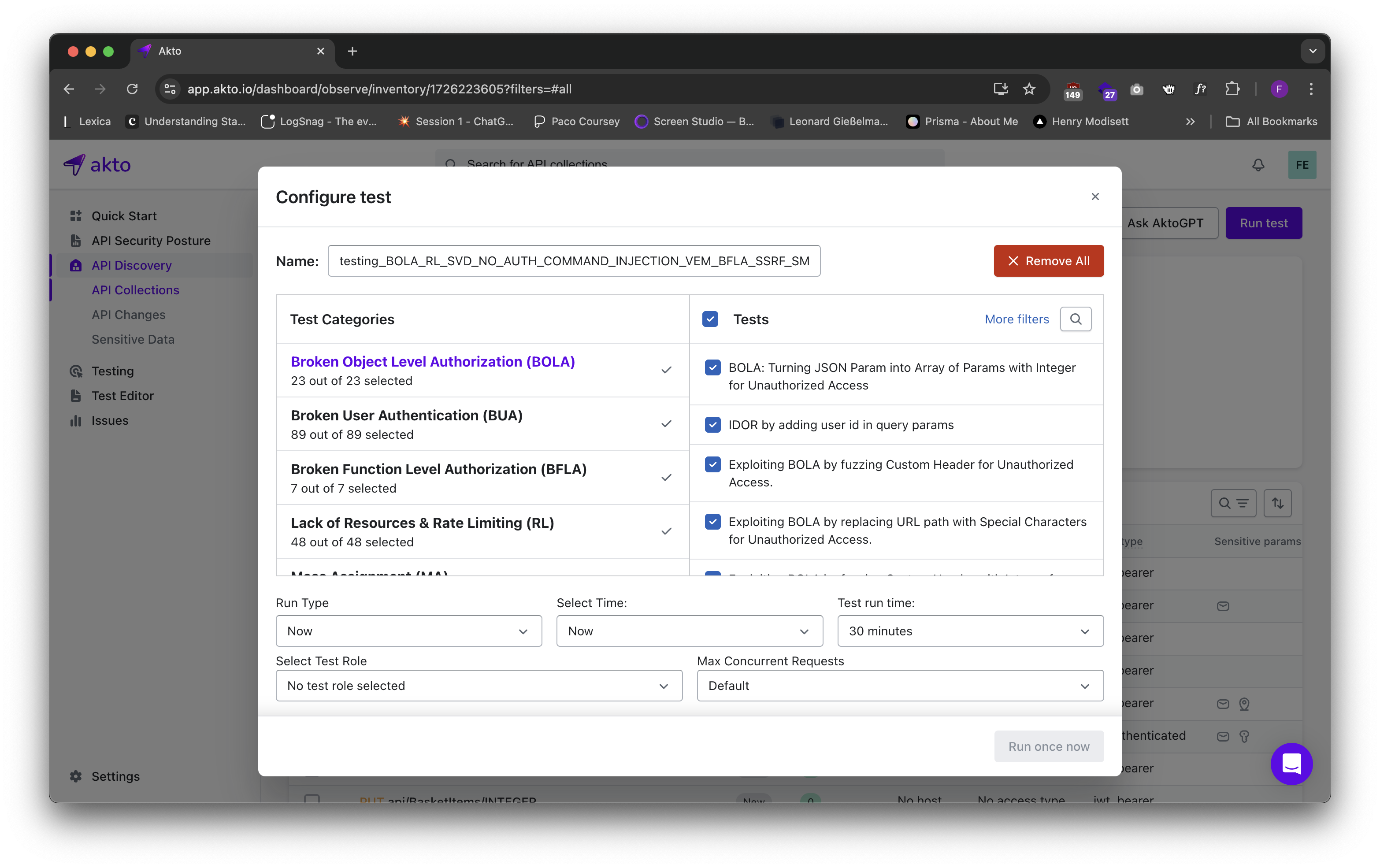 1. In the dashboard, click on the "Run Test" button and a modal will pop up, allowing you to select the Tests categories and type of tests you want to test on your collection.
