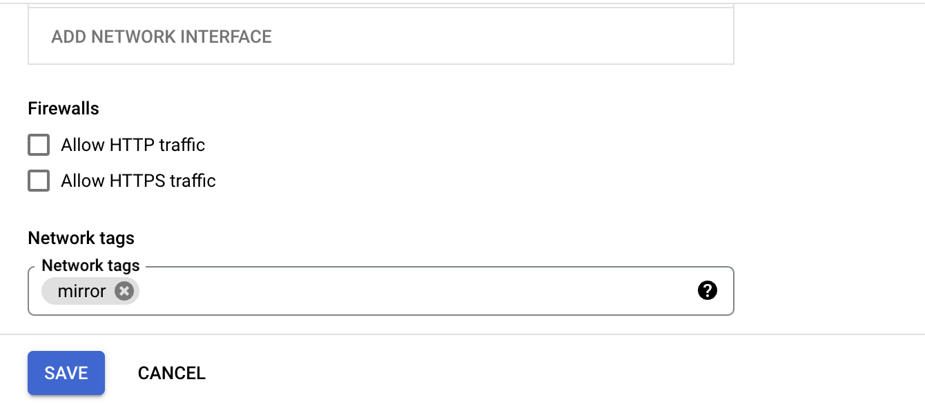 5\. Go to the instances you want to mirror and add network tag 'mirror' to them. You can do this by clicking on edit button and scrolling down to the network tags section.