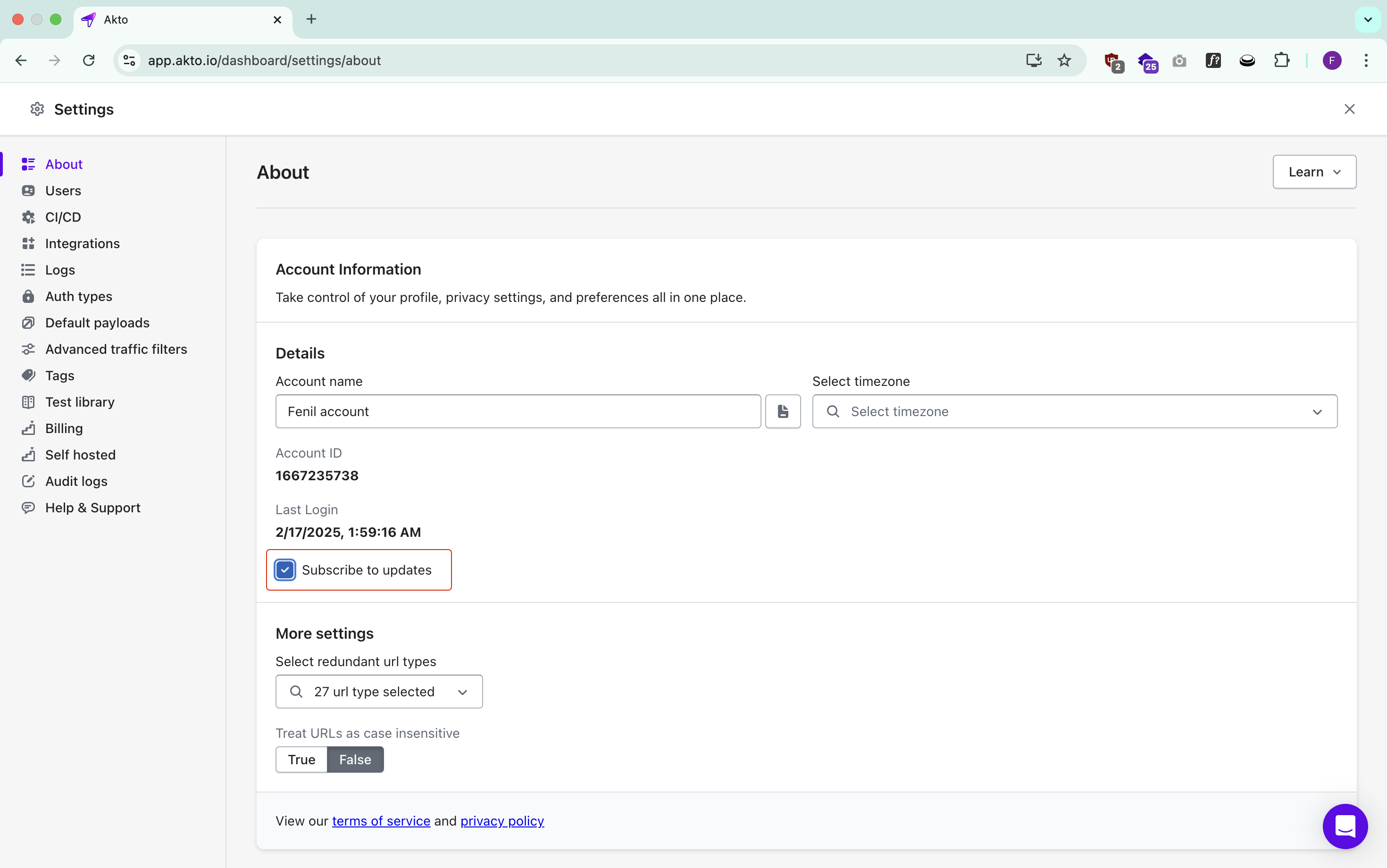 Keep informed about Akto's latest features, improvements, and security updates by enabling the 'Subscribe to updates' option in your Account Settings.