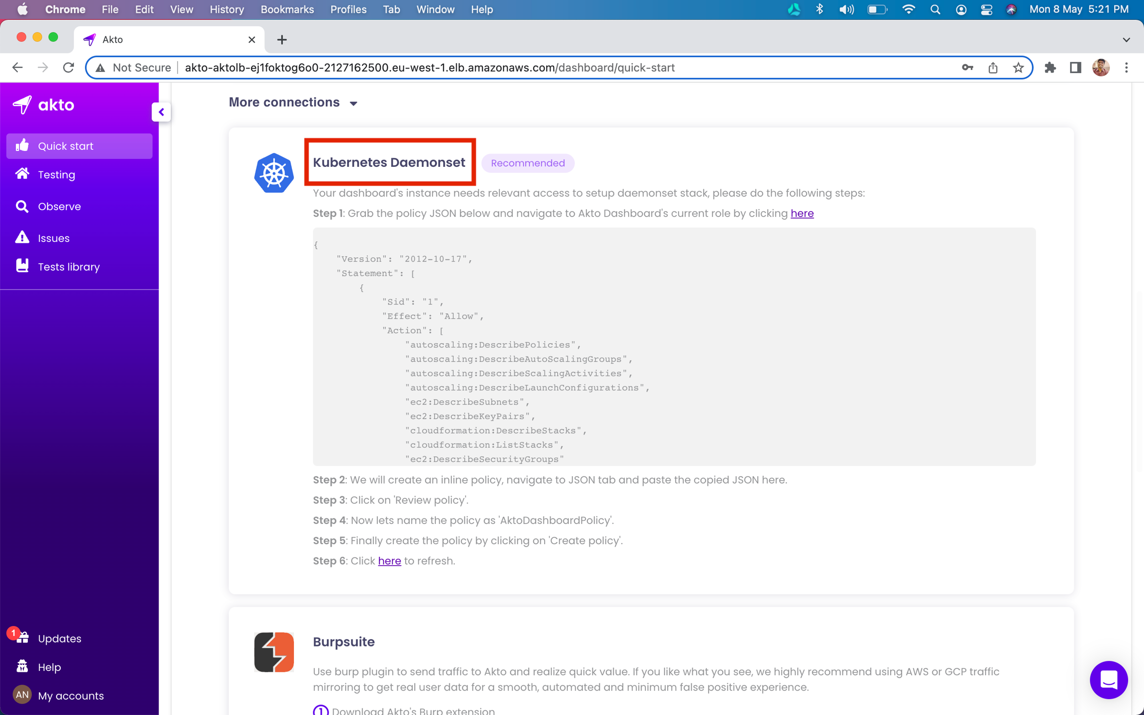 5. Call kubectl apply -f akto-daemonset-config.yaml -n <NAMESPACE> on your kubectl terminal